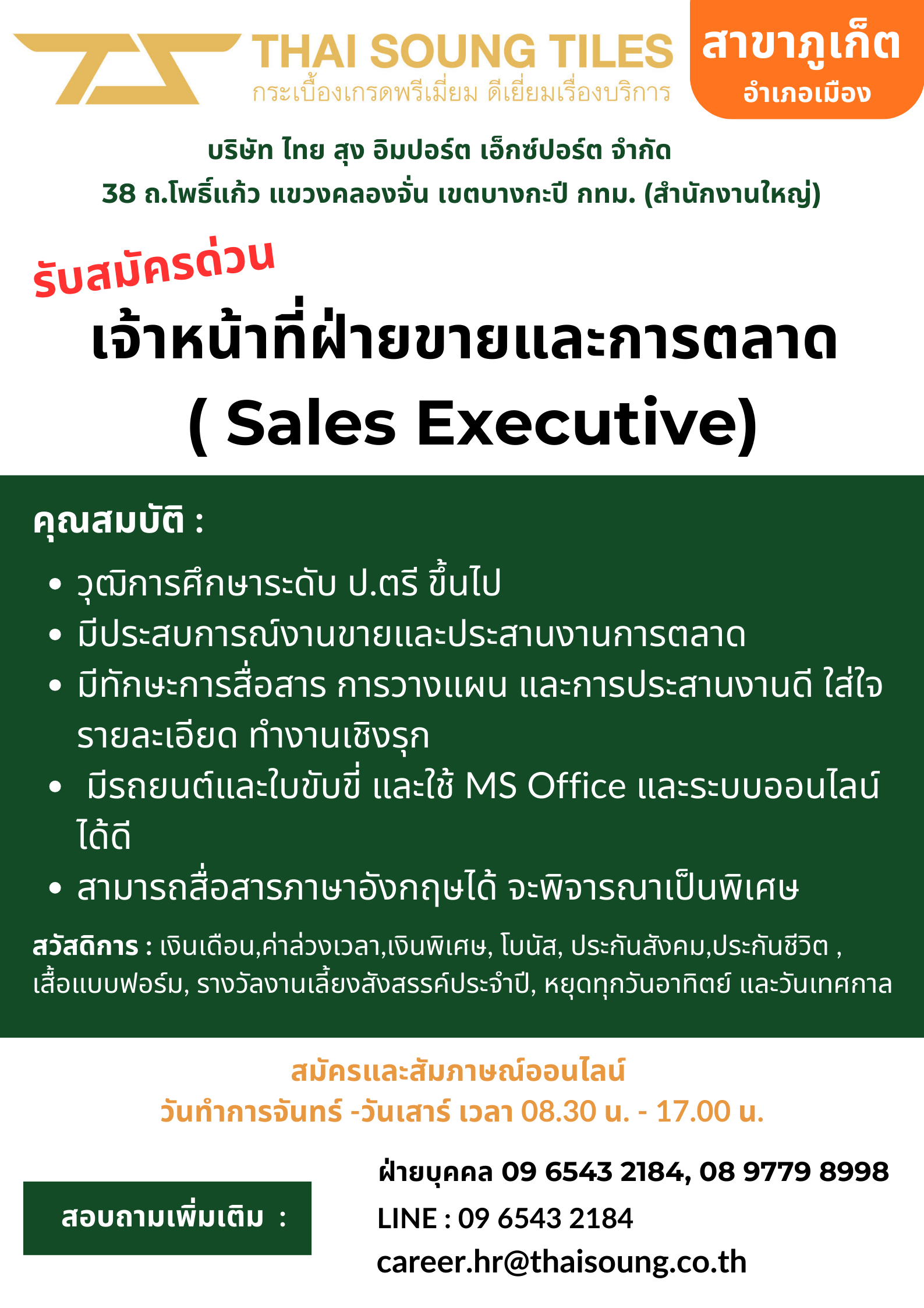 บริษัท ไทย สุง อิมปอร์ต เอ็กซ์ปอร์ต จำกัด (รับสมัครด่วน) ตำแหน่ง เจ้าหน้าที่ฝ่ายขายและการตลาด (Sales Executive)