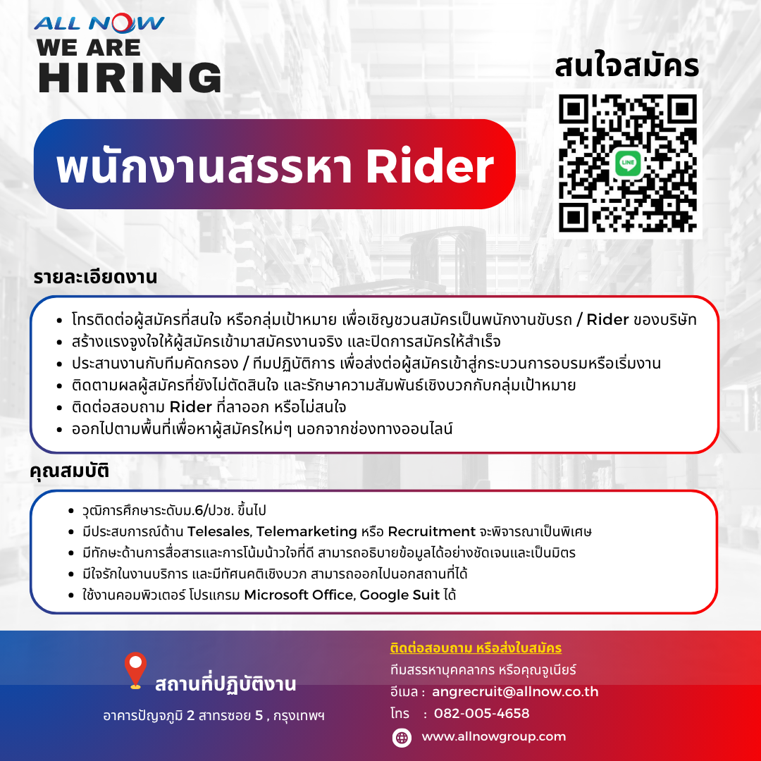 ออลล์ นาว กรุ๊ป บริษัทขนส่งในเครือเจริญโภคภัณฑ์ รับสมัครพนักงาน (ตำแหน่ง พนักงานสรรหา Rider)