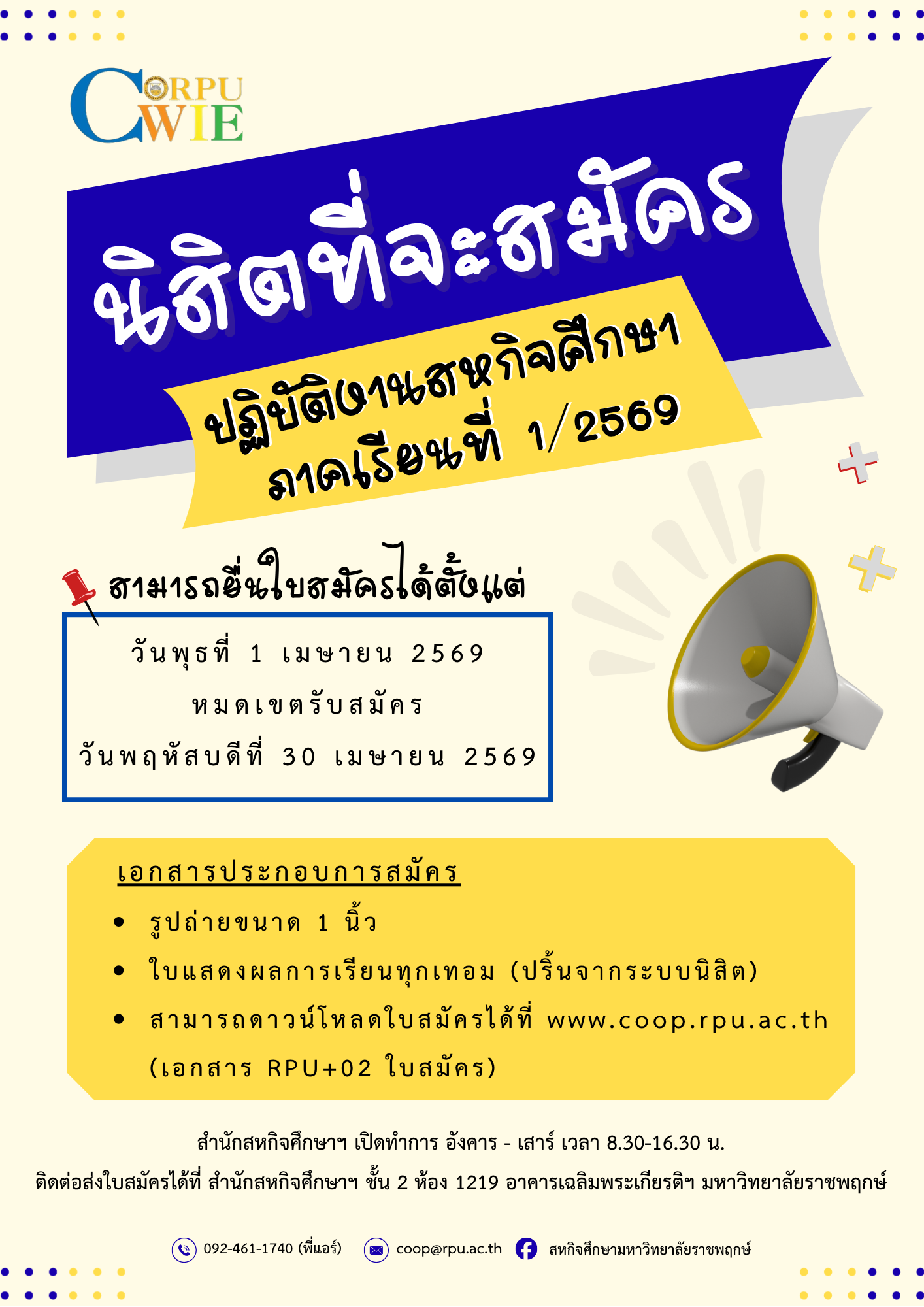 ประกาศสำหรับนิสิตที่จะออกฝึกปฏิบัติสหกิจศึกษา ภาคเรียนที่ 1/2569