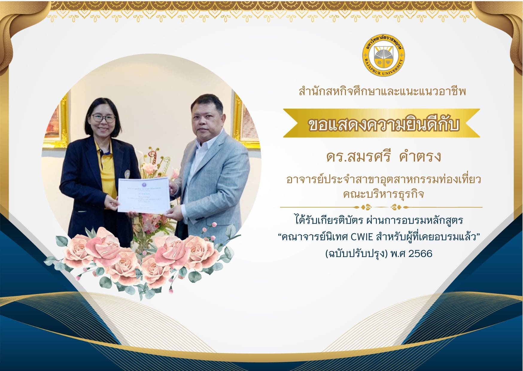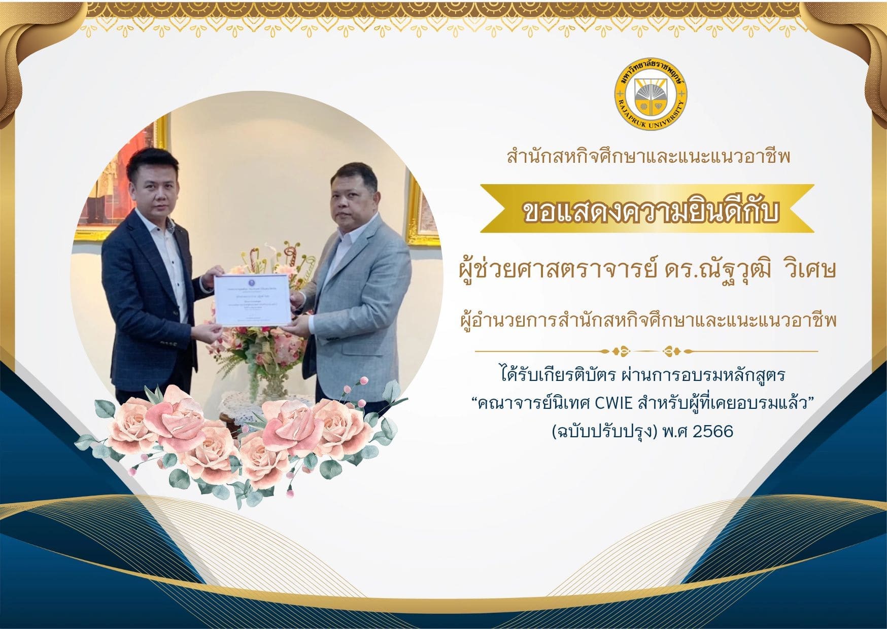 ดร.อณาวุฒิ ชูทรัพย์ อธิการบดี มหาวิทยาลัยราชพฤกษ์ ได้มอบเกียรติบัตรจากสำนักงานปลัดกระทรวงการอุดมศึกษา วิทยาศาสตร์ วิจัยและนวัตกรรม ให้กับผู้ช่วยศาสตราจารย์ ดร.ณัฐวุฒิ วิเศษ ผู้อำนวยการสำนักสหกิจศึกษาและแนะแนวอาชีพ และดร.สมรศรี คำตรง อาจารย์ประจำสาขาวิชาอุตสาหกรรมท่องเที่ยว คณะบริหารธุรกิจ ซึ่งผ่านการอบรมหลักสูตร “คณาจารย์นิเทศ CWIE สำหรับผู้ที่เคยอบรมแล้ว” (ฉบับปรับปรุง พ.ศ.2566)